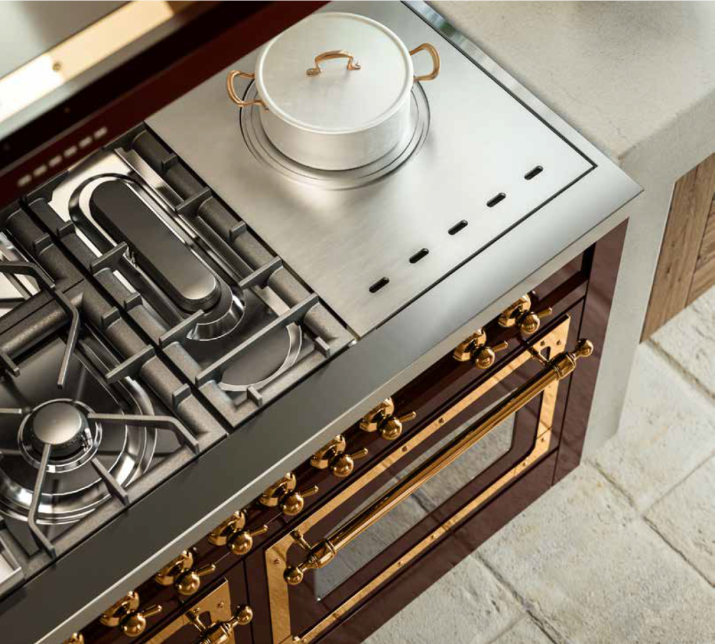 Highly professional technologies and excellent materials with a classic style that is always inspiring. Undisputed protagonists of the kitchen, they offer a complete choice of sizes from 30 to 60 inches and various configurations. You can choose the flush-top induction up to 6 cooking zones with bridge function for 48 inches version, single or double oven, standard colors or RAL colors on request, various finishes and accessories. Only available as an option for the Nostalgie collection, Noblesse frames are more than just a detail: they are a fine design feature that frames the front panels, matching the metallic finishes of the handles and knobs.