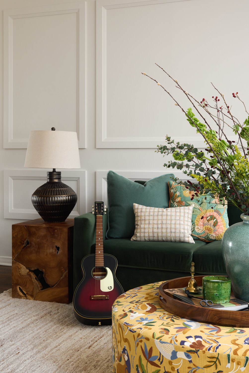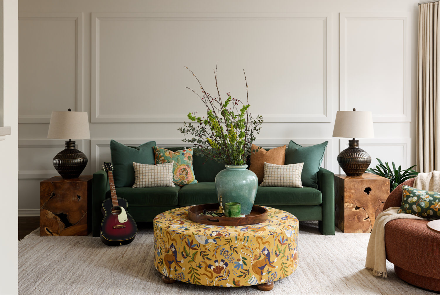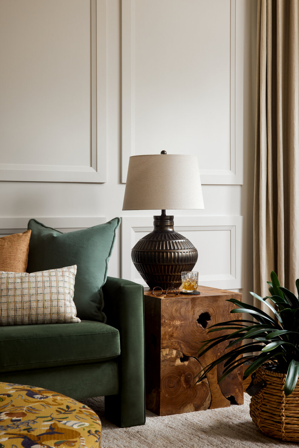 MDF wainscotting panels installed in an overlay pattern on the sofa wall. Paint match ceiling, walls and trim throughout the space. Long linen drapes on windows. Ottoman upholstered with Into The Woods fabric by Fabricut. Pillow upholstered with Nuphar fabric by Zak + Fox. Furniture pieces supplied by Dala Decor.
