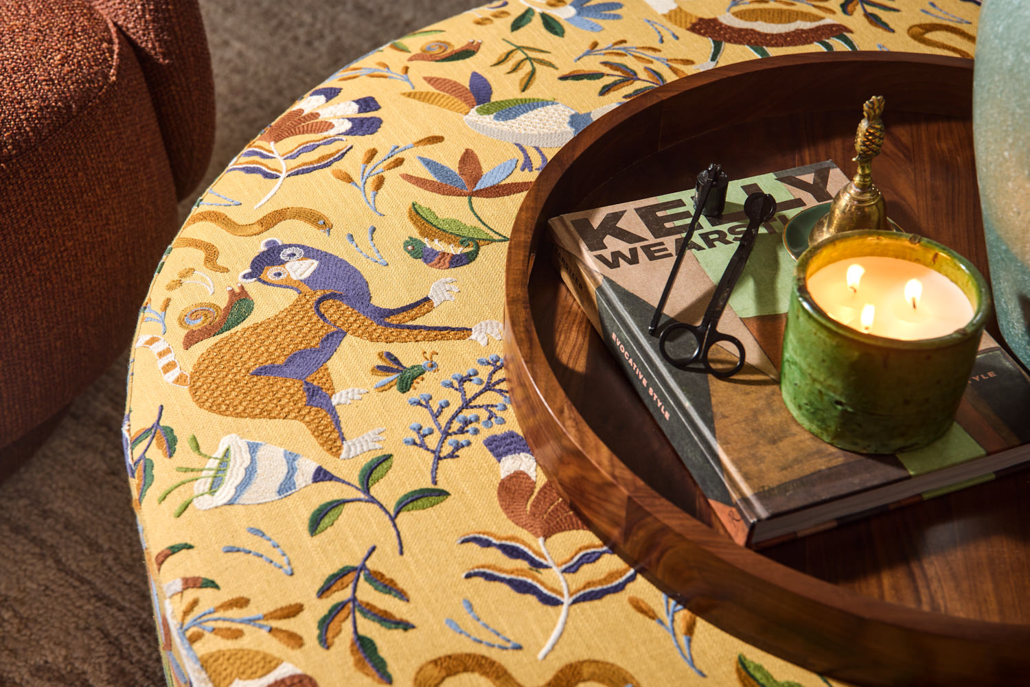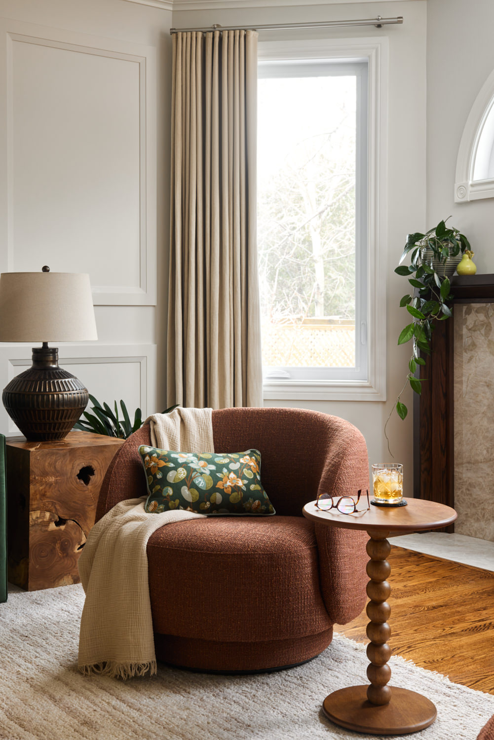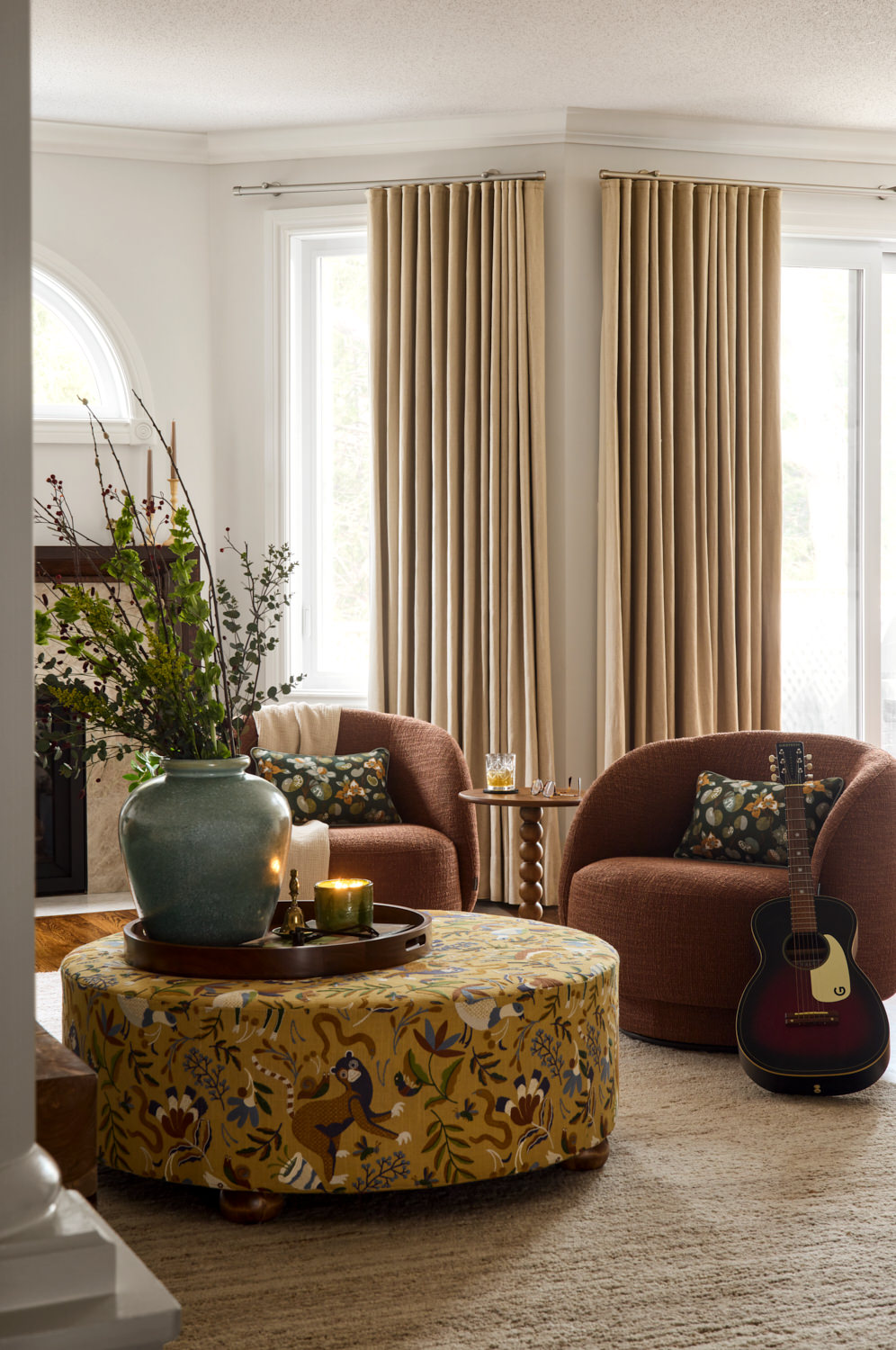 MDF wainscotting panels installed in an overlay pattern on the sofa wall. Paint match ceiling, walls and trim throughout the space. Long linen drapes on windows. Ottoman upholstered with Into The Woods fabric by Fabricut. Pillow upholstered with Nuphar fabric by Zak + Fox. Furniture pieces supplied by Dala Decor.