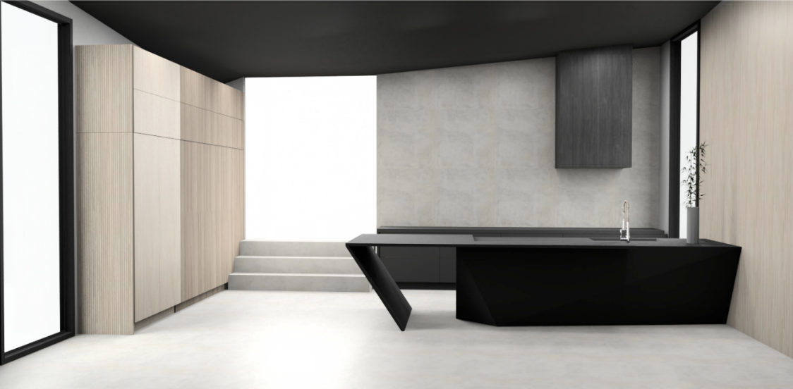 The kitchen countertops are designed with Porcelanosa Karachi Grey porcelain slabs while the full height backsplash uses the same Porcelanosa Bottega Acero porcelain slab that matches the floor tile.