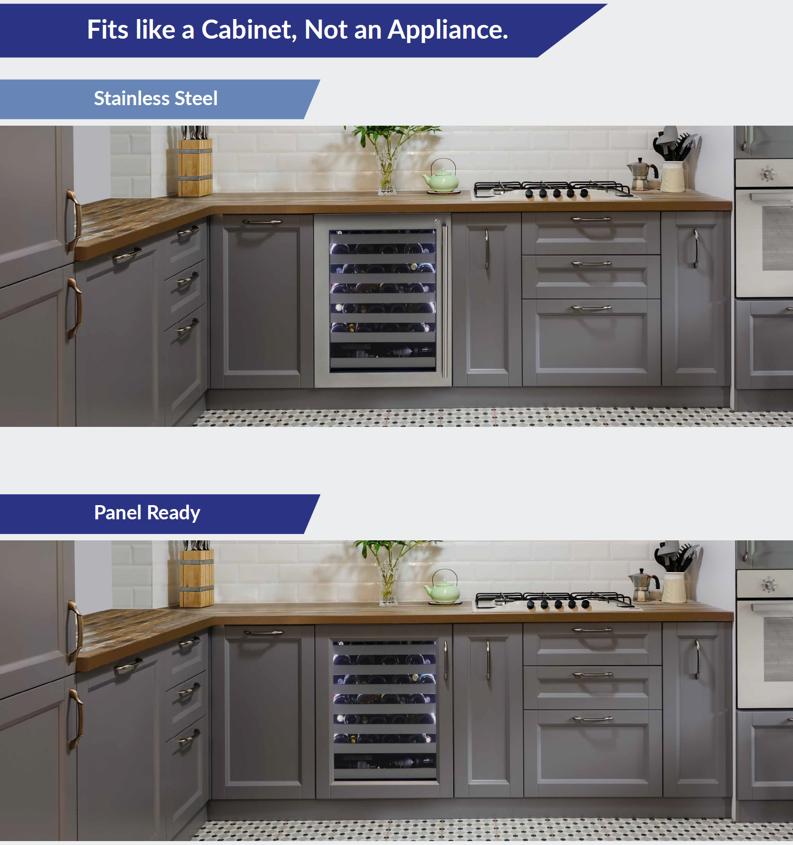 Available in 24″ and 15″ width makes it easy to integrate a beverage cooler, wine refrigerator or ice machine into any kitchen layout. The stainless steel finish can be replaced with custom colors and textures to match your kitchen design.