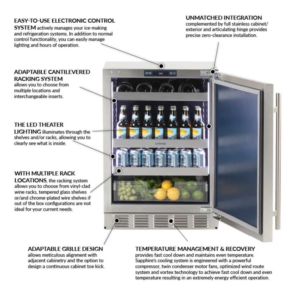 Sapphire models have been precisely engineered both indoor and outdoor kitchens. With the ability to manage a variety of wine bottles and beverage cans, Sapphire provides the right fit for your lifestyle and kitchens functionality.