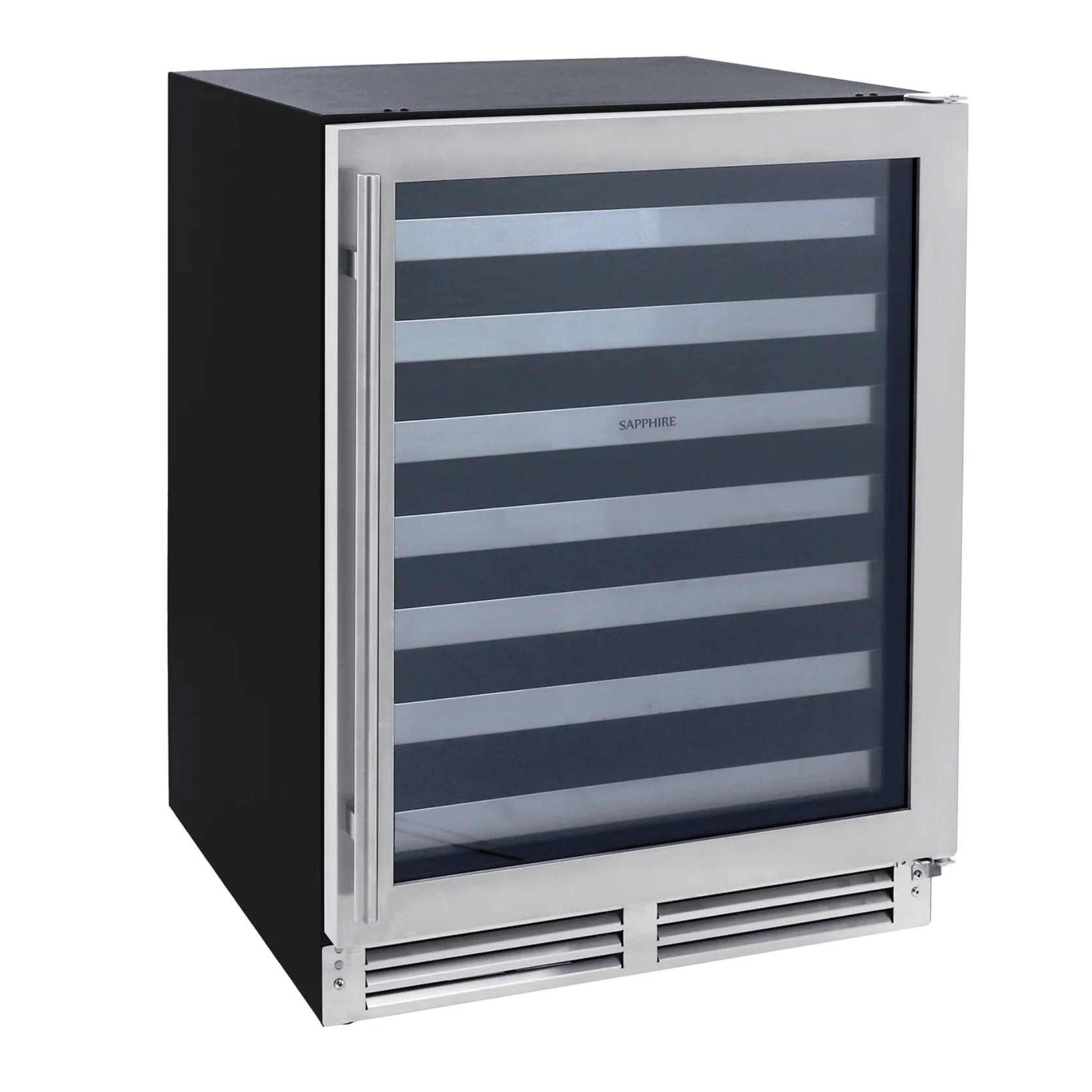 Undercounter single zone refrigerator with glass door that is designed to add additional cold storage for wine while protecting and showcasing the collection. Storage capacity can hold up to 54 bottles.