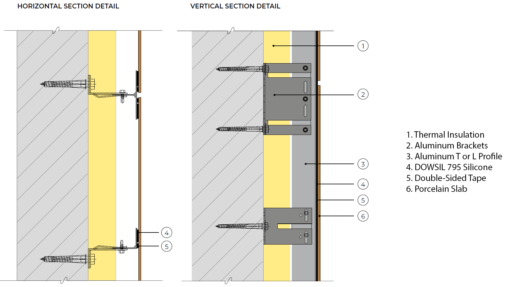 The exact same system as above with the added aluminum support brackets anchored into the wall and porcelain slabs. The total system thickness will vary based on the thickness of the thermal insulation used.